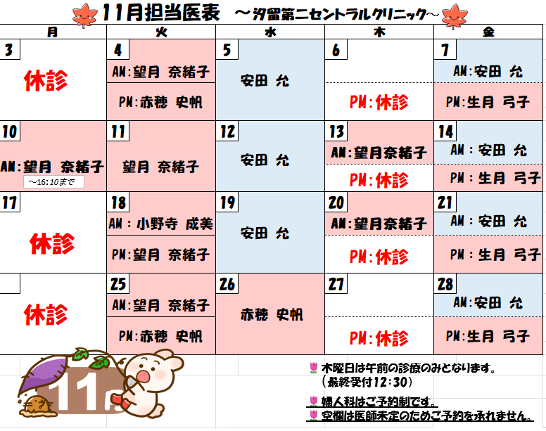 担当医名の記載がない日程はご予約を承ることが出来ません。